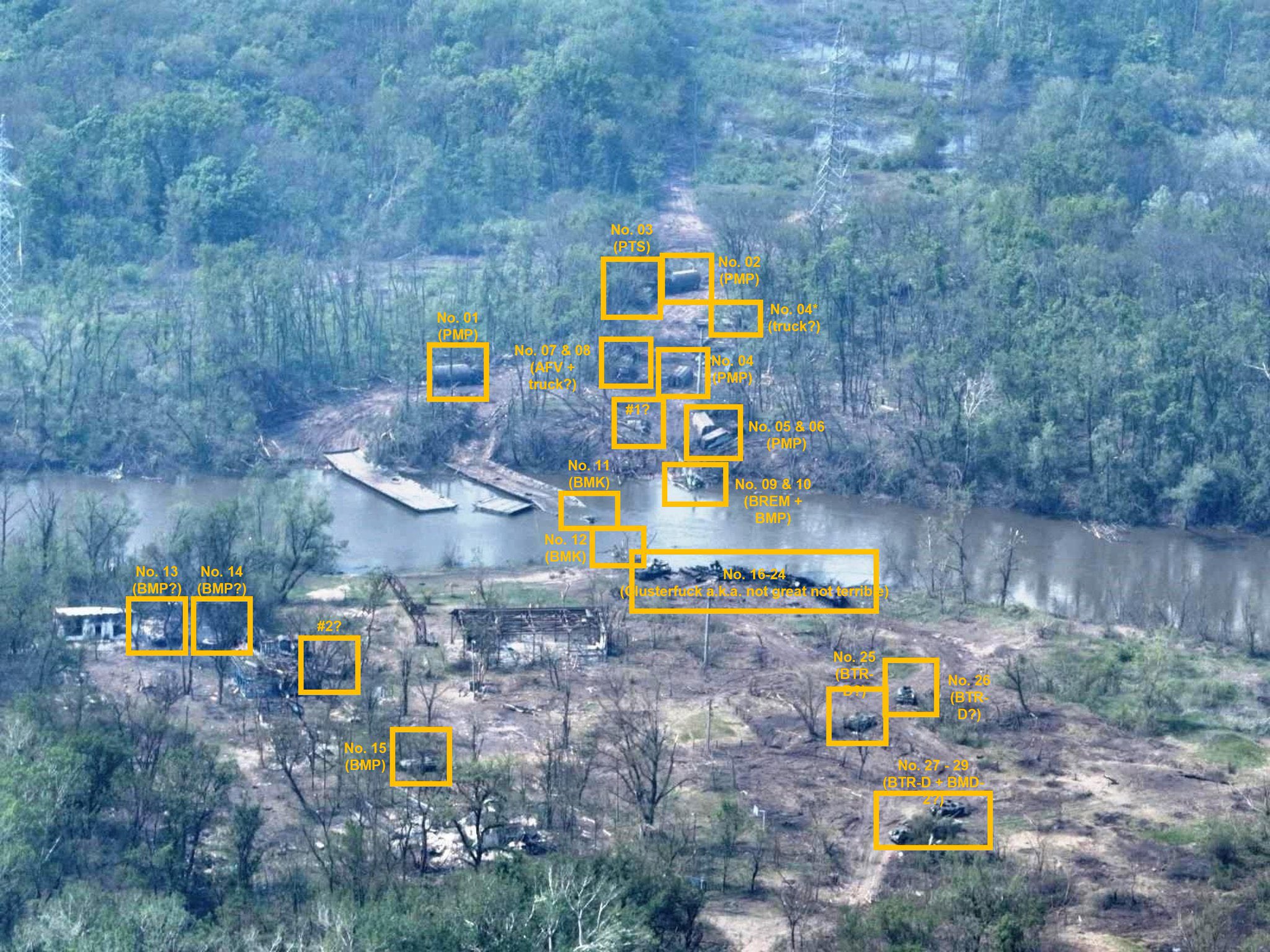 За четыре дня Россия потеряла или бросила 73 единицы военной техники в результате неудачной переправы через реку Северский Донец в районе Белогоровки. Это выяснил расследователь BlueSauron, занимающийся освещением военных конфликтов на основе открытых данных.