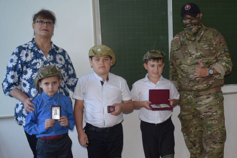 В сообщении говорится, что урок прошел 3 октября, руководство называет бойца «почетным гостем», который рассказывал детям «о важной роли подразделения на Донбассе». Боец показал экипировку, которую он «использовал во время боевых действий» и награды: медаль «За Отвагу»; «За взятие Попасной» и золотой крест 1-й степени, выдаваемый ЧВК.