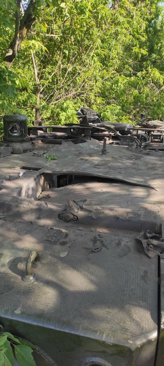 Появилось фото поврежденного танка Leopard 2A4. Отмечается, что его башня пробита ровно над местом наводчика, который, вероятно, погиб в результате удара, если находился на нем. Кроме того повреждены панорамный прицел командира PERI R17 и прицел наводчика EMES-15.
