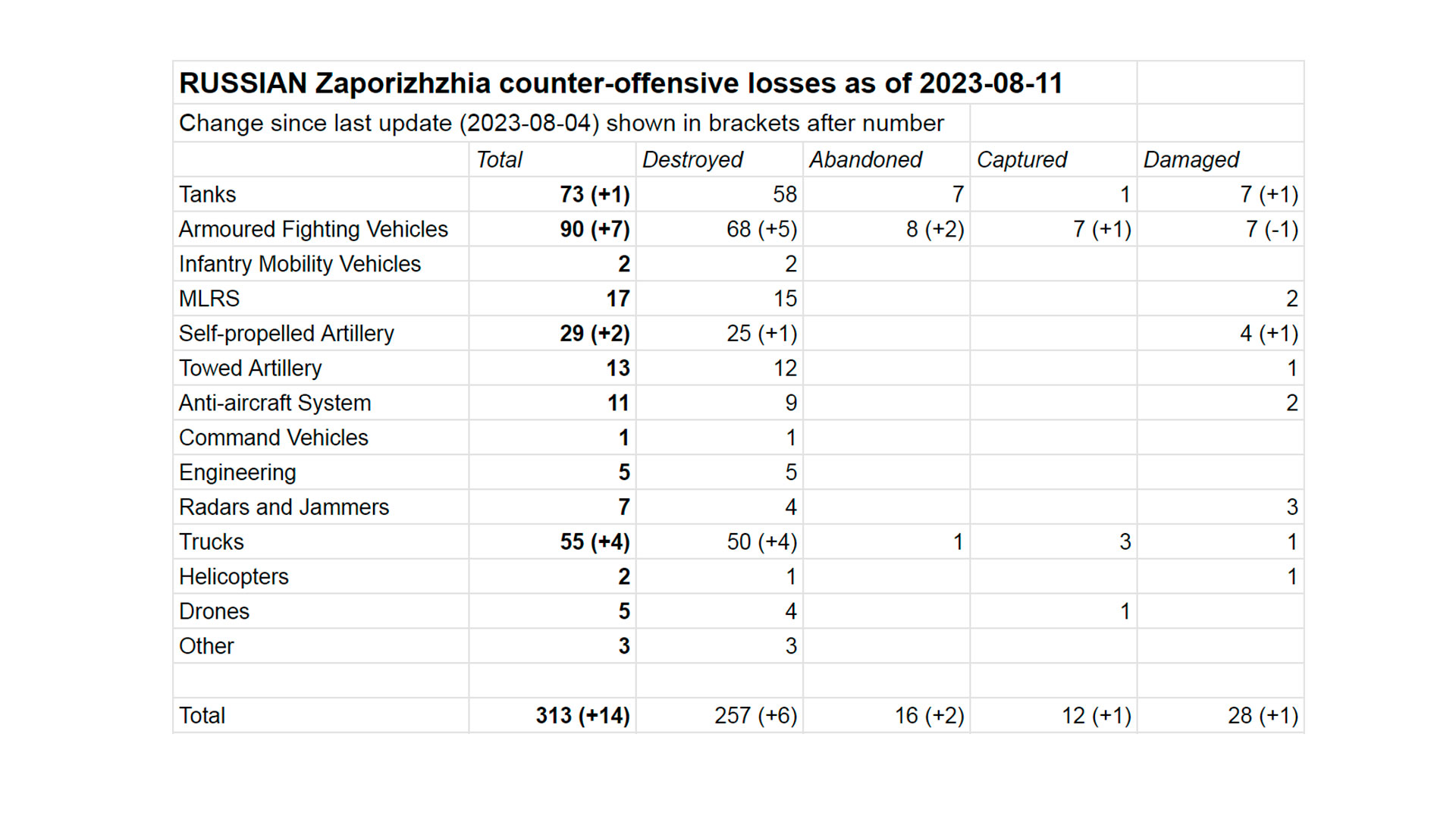 По состоянию на 11 августа 2023 года потери украинской военной техники и вооружений в ходе контрнаступления составили 322 единицы, российские — 313 единиц. Подтвержденные потери за последнюю неделю — 12 единиц у ВСУ и 14 у ВС РФ.