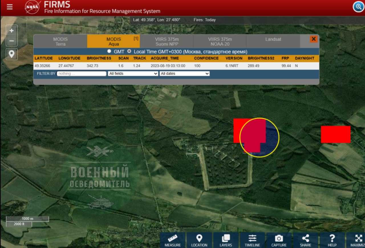 В ночь на 19 августа российские военные нанесли удар по Хмельницкой области. Жители города и окрестностей сообщали, что слышали мощные взрывы в Летичевском районе. Также они видели яркое красное зарево в небе, а взрывная волна выбила окна в некоторых домах. Как пишет «Военный Осведомитель», был уничтожен склад боеприпасов. На карте пожаров NASA зафиксировано обширное возгорание в 3 часа ночи в районе арсенала в/ч 28305 около Лысогорки в Летичевском районе. Место и время пожара полностью совпадают с показаниями местных жителей.