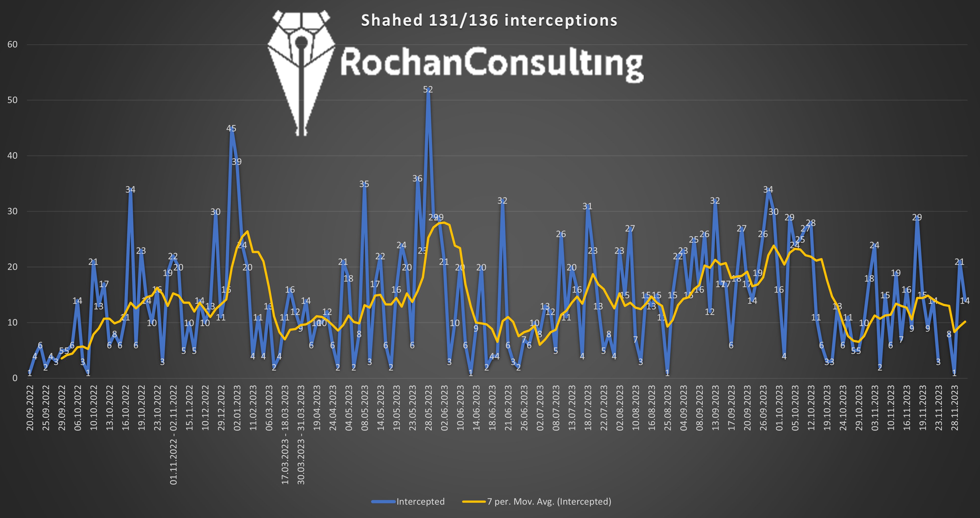 Военный эксперт Конрад Музыка публикует график количества «Шахедов», задействованных в налетах, и приходит к выводу, что самая массированная атака дронами в ночь на 25 ноября оказалась исключением, а не новой тенденцией, и без учета этого налета общий темп применения «Шахедов» кажется довольно низким. Также он предполагает, что налет 25 ноября мог быть своего рода «напоминанием» от Минобороны РФ в годовщину Голодомора.