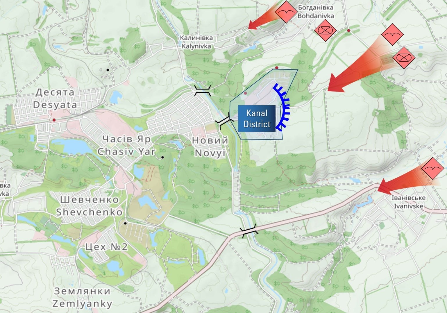 Российская 98-я гвардейская воздушно-десантная дивизия (в ее составе числятся 217-й, 299-й и 331-й парашютно-десантные полки) сообщает о продвижении в лесном массиве восточнее Часова Яра и южнее городского микрорайона «Канал».