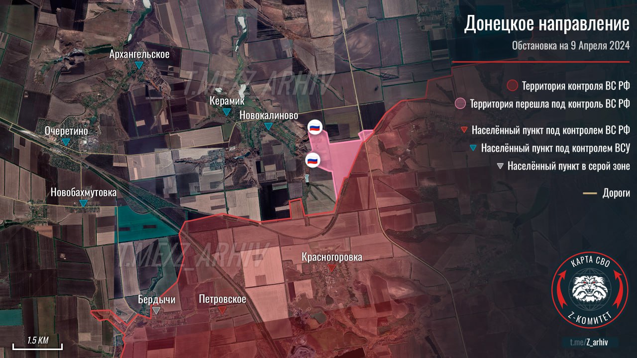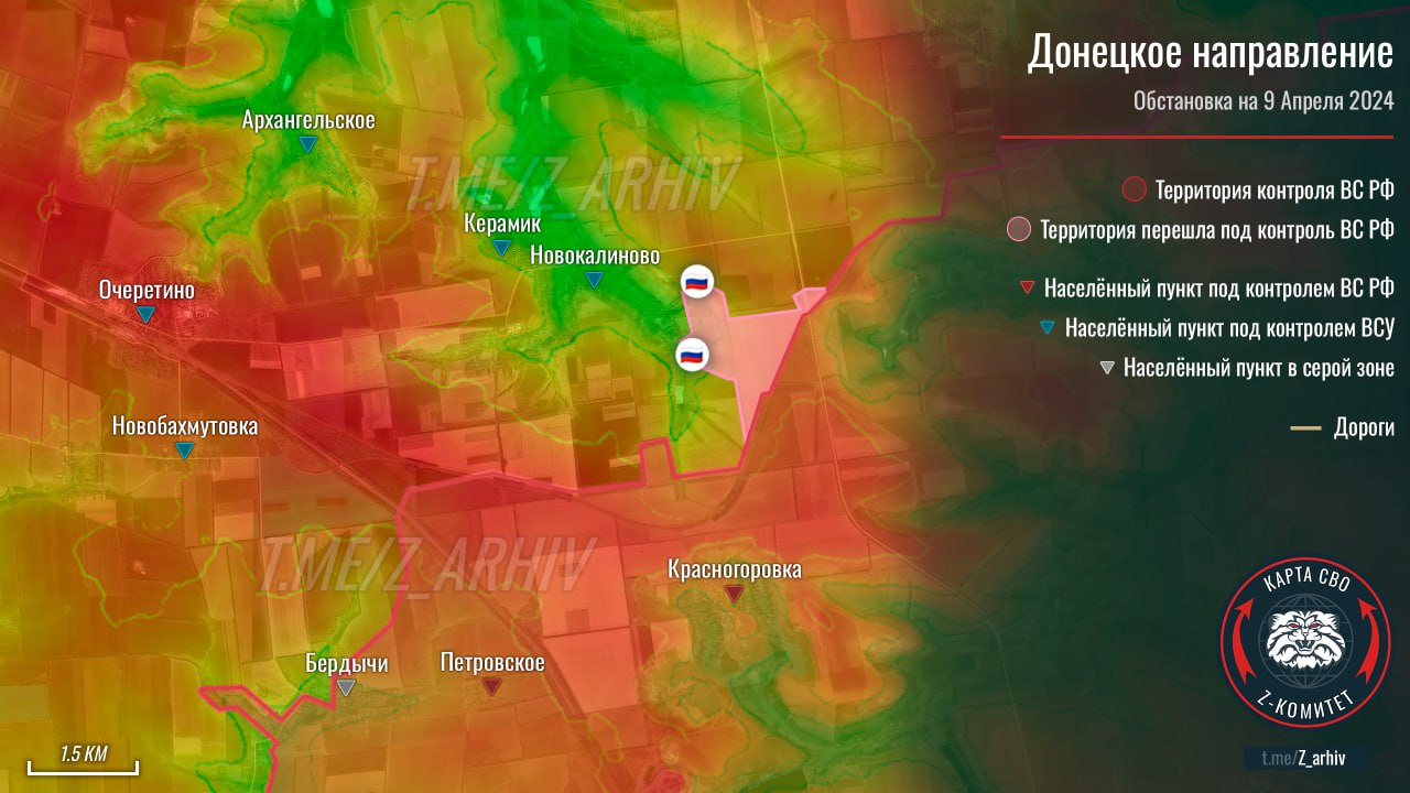 Тем временем Telegram-канал «Z комитет + карта СВО» показывает на карте продвижение ВС РФ в сторону Новокалиново на северном фасе текущей полосы наступления в районе Авдеевки.