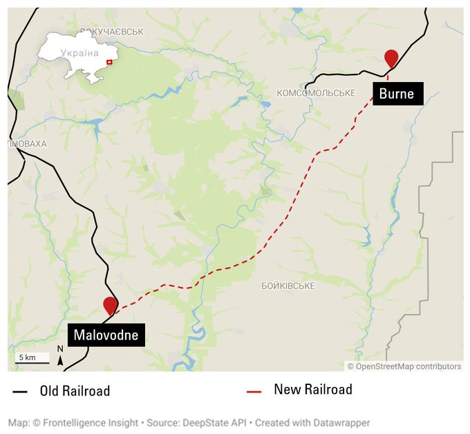 Как сообщает Tatarigami_UA, ссылаясь на оценку Frontelligence Insight, «в течение нескольких недель или дней» на оккупированных территориях Донецкой области заработает новая железнодорожная ветка между Бурным и Маловодным. Спутниковые снимки подтверждают ограниченное движение поездов на этом участке.
