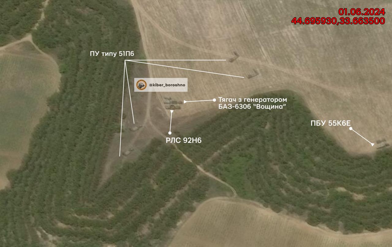 OSINT-проект «КіберБорошно» опубликовал снимки последствий удара по комплексу С-400 «Триумф» в Бахчисарайском районе: заявляется уничтожение РЛС 92Н6 и тягача с генератором БАЗ-6306 «Вощина», а также поражение пусковой установки 51П6.