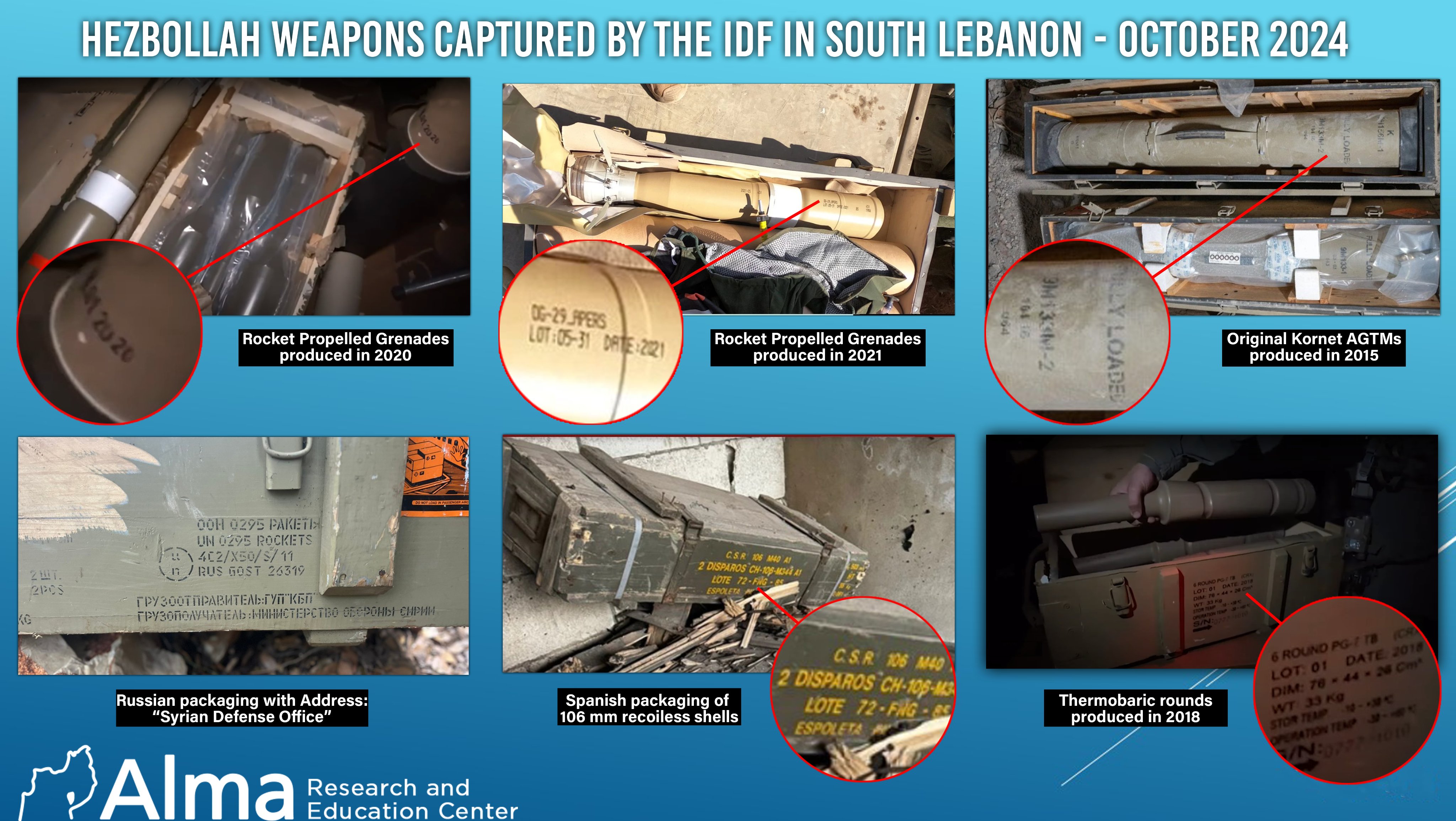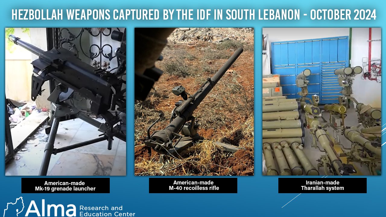 Среди захваченного оружия у сил «Хезболлы» есть винтовки, гранатометы, ПТУРы, мины и взрывчатка. Оружие выглядит новым и было произведено в последние годы в разных странах.