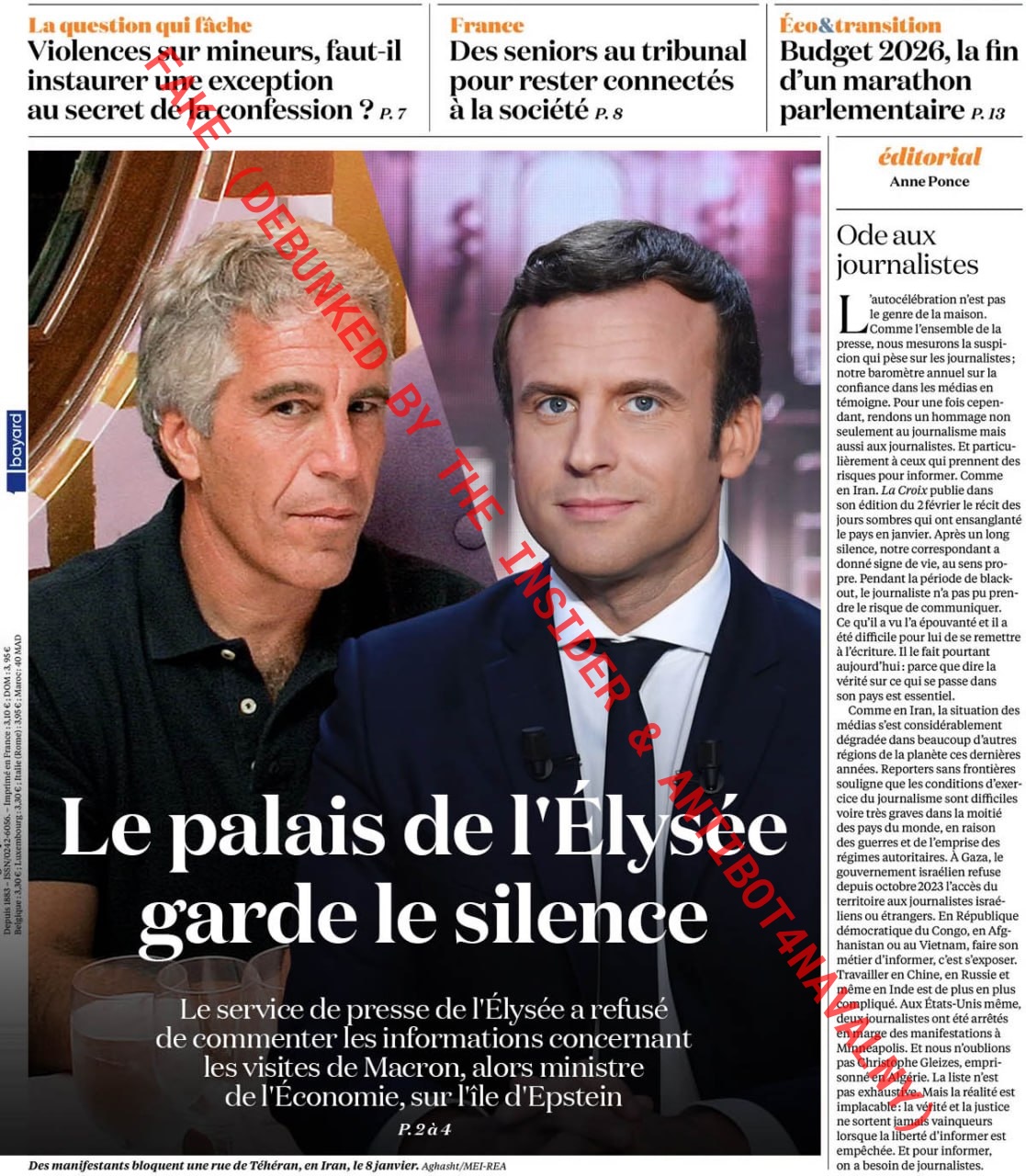 Дезинформация также распространяется через сфабрикованные обложки французских изданий. На поддельной обложке La Croix (реальная обложка номера) утверждается, что Елисейский дворец отказался комментировать визиты Макрона на остров Эпштейна. Фальшивые обложки Le Parisien (реальная обложка номера) и Libération (реальная обложка номера) от 2 февраля 2026 года утверждают, что Макрон 18 раз за 18 месяцев посещал остров Эпштейна в период работы министром экономики.
